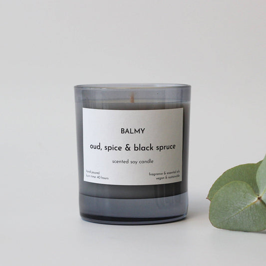 Oud, Spice & Black Spruce Candle – 220g Soy Wax by Balmy